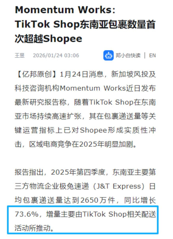 新加坡风投及科技盘问机构Momentum Works的打听磋商显现,2025年第四季度,极兔速递日均包裹寄递量达到2650万件,同比增长73.6%,增量主要由TikTok Shop有关配送步履所鼓励。