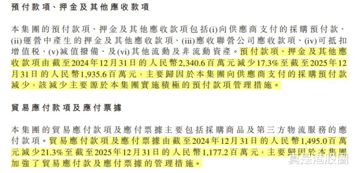 如果进一步看金钱欠债内外的细项,这种改善其实更明晰。领先,预支款项、押金过甚他应收款项从 2024 年末的 23.41 亿元降至 2025 年末的 19.36 亿元,同比着落 17.3%,公司在年报中明确诠释,主淌若因为向供应商支付的采购预支款减少,背后反应的是其对预支款项科罚更积极。