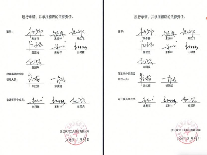截图永诀取自欣兴用具2026一版和二版招股书,两版招股书中欣兴用具董监高们的署名字迹基本调换,以至连盖印位置也基本调换,独一赫然不同的等于题名本事。一个东谈编缉迹调换不错结合,当十几个东谈编缉迹都基本调换以至连盖印位置也访佛雷同时,这就分歧情理了。